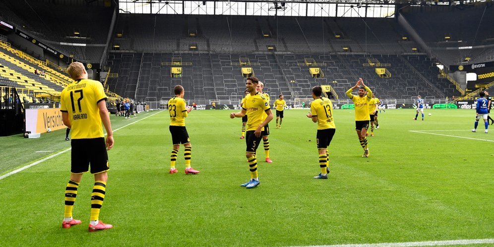 Borussia Dortmund berhasil memetik poin penuh atas Schalke di Revierderby. Pada laga yang dihelat tanpa penonton di Signal-Iduna Park, Sabtu (16/5/2020) malam WIB, Dortmund menang dengan skor telak 4-0