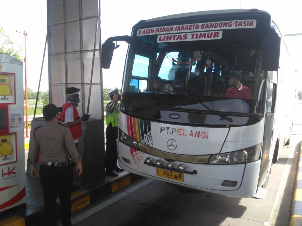OKI, KRSUMSEL.com – Petugas Pos Chek Poin Pengamananan Operasi Ketupat Musi 2020 Gerbang Tol Kayuagung bersama petugas dari Gugus Tugas Covid-19 Kabupaten OKI menghentikan bus Antar Kota antar Provinsi (AKAP) Pelangi asal Medan Sumatera Utara yang nekat mengantar penumpang dengan tujuan Pulau Jawa.