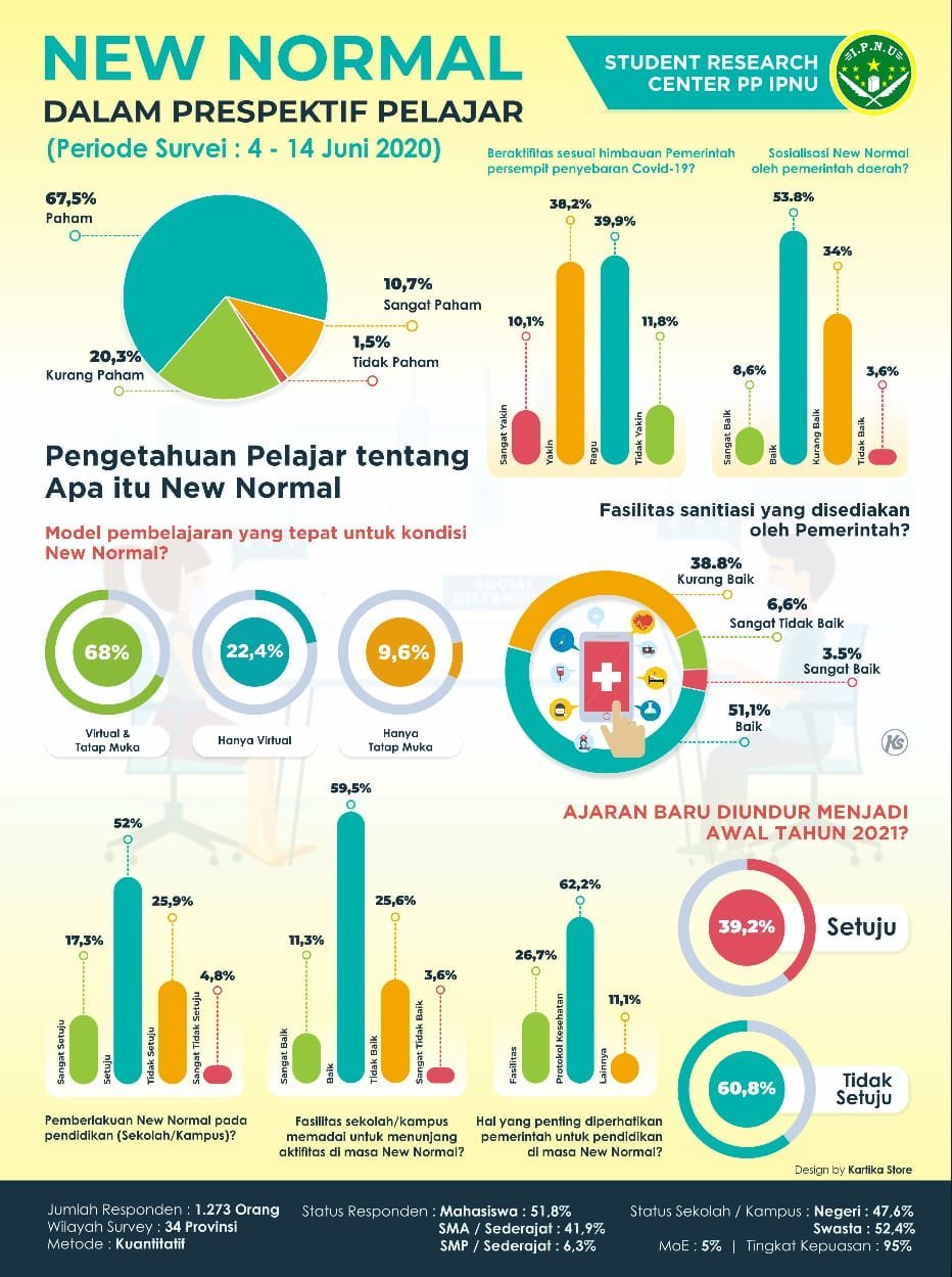 Lembaga Student Research Center (SRC) Pimpinan Pusat Ikatan Pelajar Nahdlatul Ulama (PP IPNU) melakukan survei tentang New Normal dalam prespektif pelajar. survei dilakukan pada tanggal 4-14 Juni 2020, dengan responden 1.273 Pelajar SMP, SMA dan Mahasiswa di 34 Provinsi di Indonesia.
