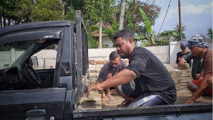 Mereka menurunkan paving block dari mobil dan menyusunnya di pelataran bangunan.