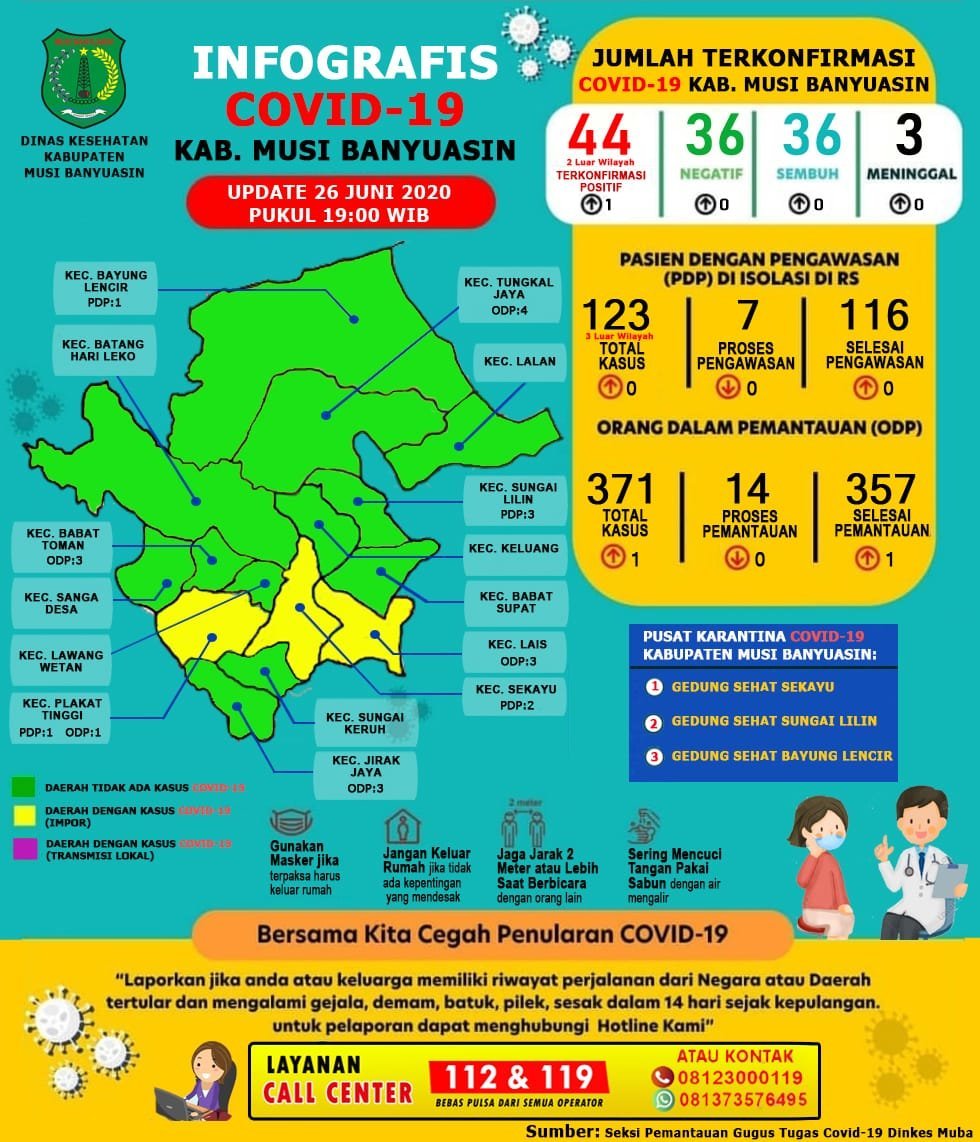 Muba, KR Sumsel – Gugus Tugas Penanganan Covid-19 Kabupaten Musi Banyuasin, Jumat (26/6/2020) mengkonfirmasi penambahan satu kasus positif covid-19.