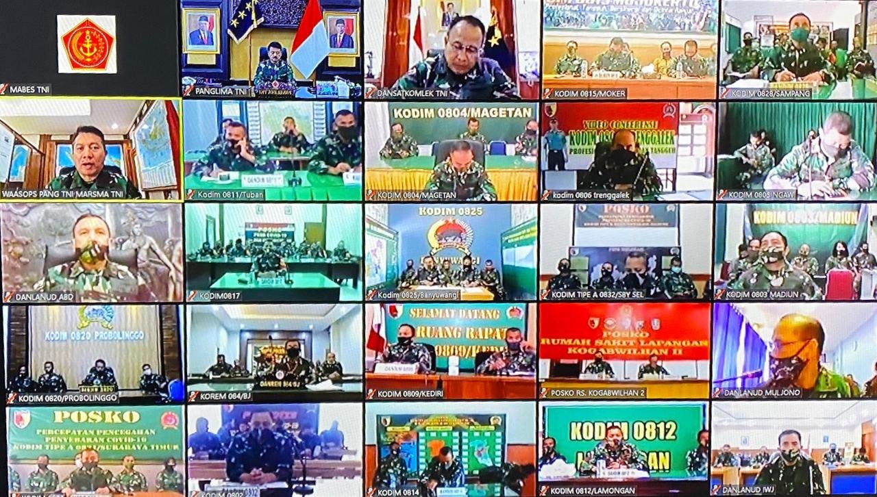 Pada video conference tersebut, Panglima TNI menerima laporan langsung terkait situasi terkini dan evaluasi terhadap upaya penanganan penyebaran Covid-19 di wilayah Jawa Timur dari Pangdam V/Brawijaya Mayjen TNI Widodo Iryansyah, S.Sos., M.M.