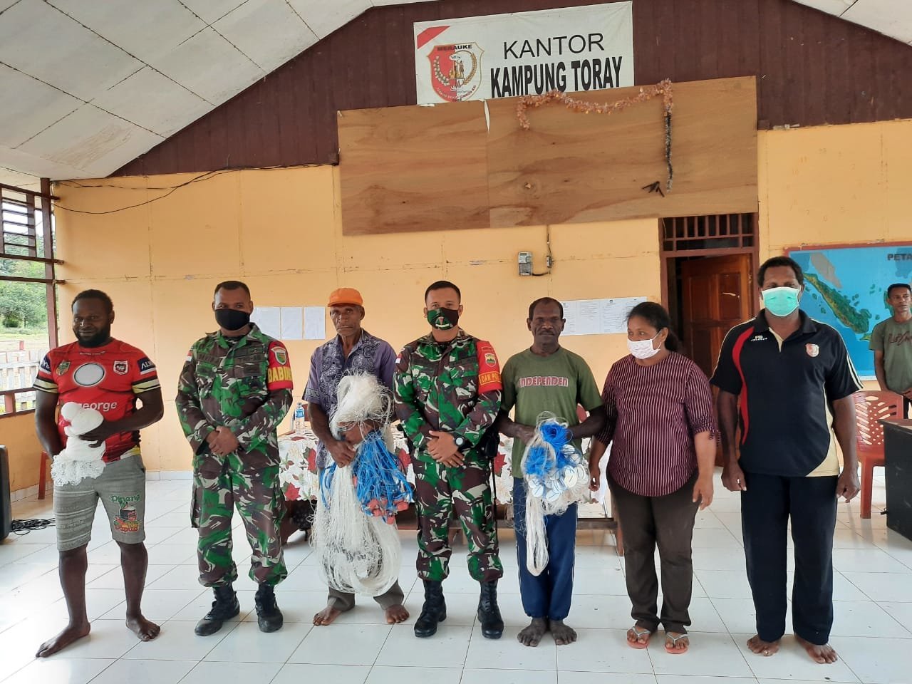 Bantuan Sosial dalam bentuk Sembako diberikan kepada 177 Kepala Keluarga (KK) warga Kampung Toray, Distrik Sota, Kabupaten Merauke, Provinsi Papua. Selain Sembako, Kepala Kampung Toray juga menyerahkan bantuan berupa jala, jaring ikan nila dan jaring ikan kakap.
