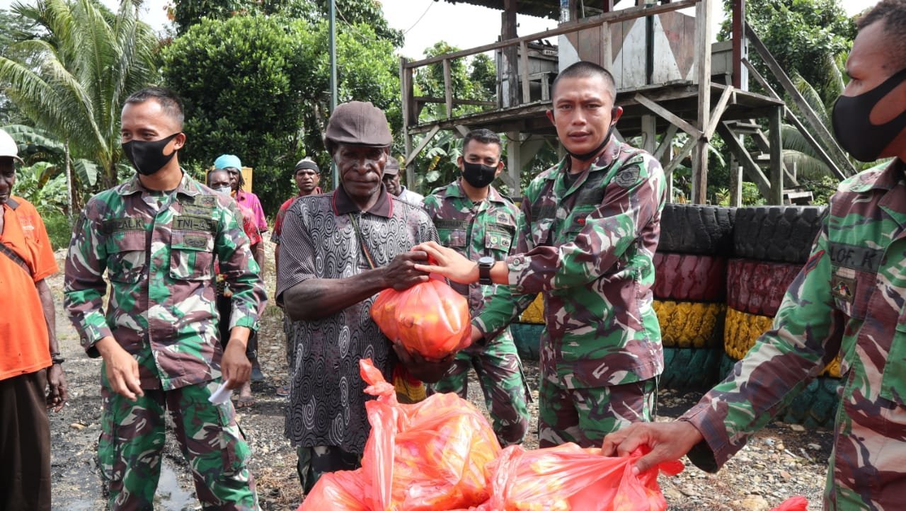 KRSUMSEL.com – (Papua. Senin, 6 Juli 2020). Prajurit Komando Taktis (Kotis) Satgas Pengamanan Daerah Rawan (Pamrahwan) Yonif 754/ENK/20/3 Kostrad semangat membagikan paket bahan makanan kepada masyarakat Kampung Nayaro Distrik Mimika Baru, Kabupaten Mimika, Papua, Minggu (5/7/2020).