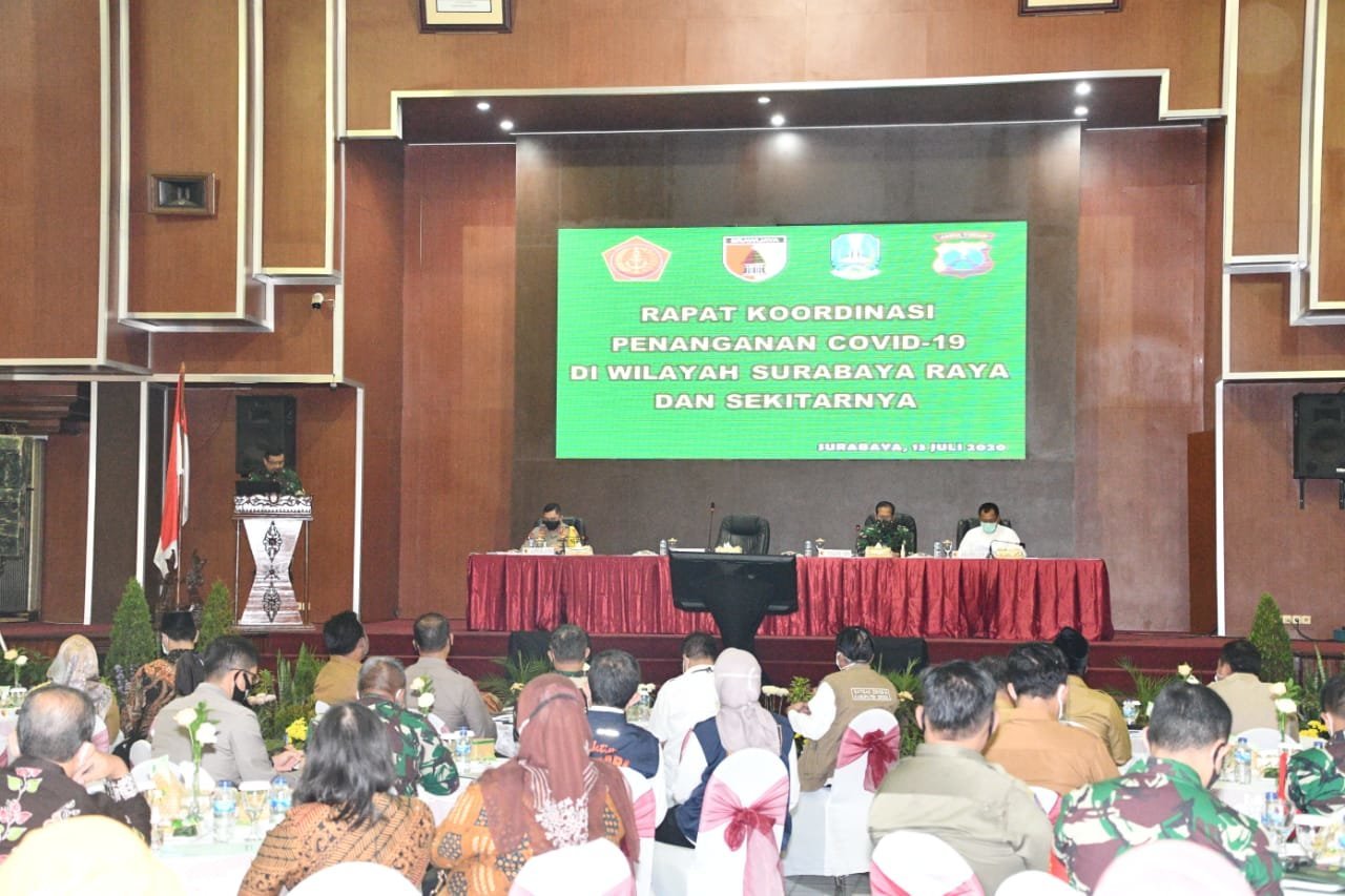 Surabaya, KRSUMSEL.com – (Penkogabwilhan II). Pangkogabwilhan II Marsdya TNI Imran Baidirus, S.E., memimpin Rapat Koordinasi (Rakor) penanganan Covid-19 Wilayah Surabaya Raya dan sekitarnya yang di gelar di Balai Prajurit Kodam V/Brawijaya Surabaya, Senin (13/7/2020).