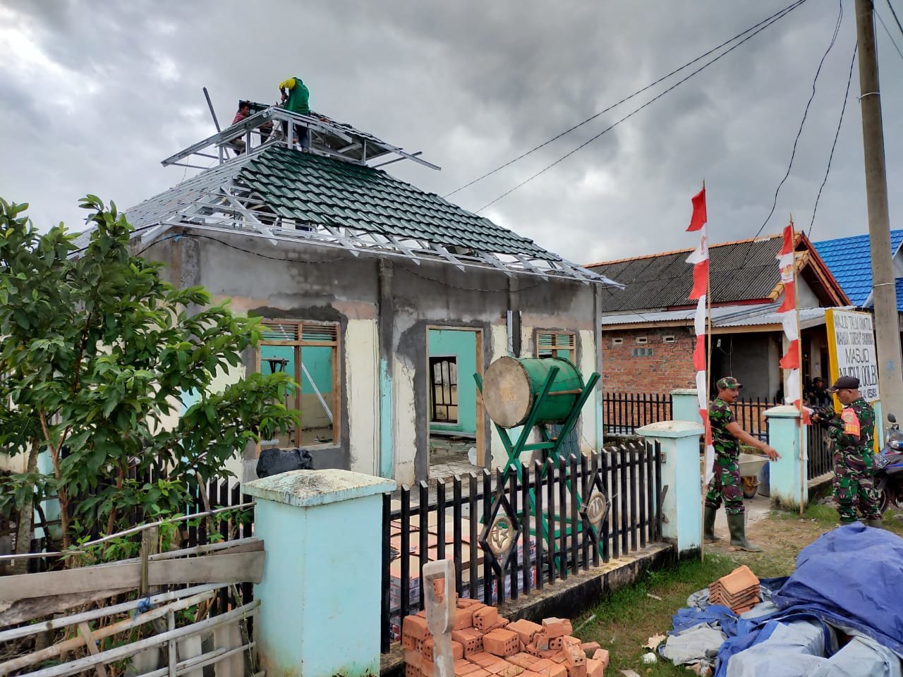 Personel yang terlibat dalam program TMMD khususnya di pos pembangunan Masjid Nurul Qolbi Desa Pulau Negara Kecamatan Pemulutan Barat Kabupaten Ogan Ilir ini akan merampungkan seluruh atap masjid beberapa hari ini.