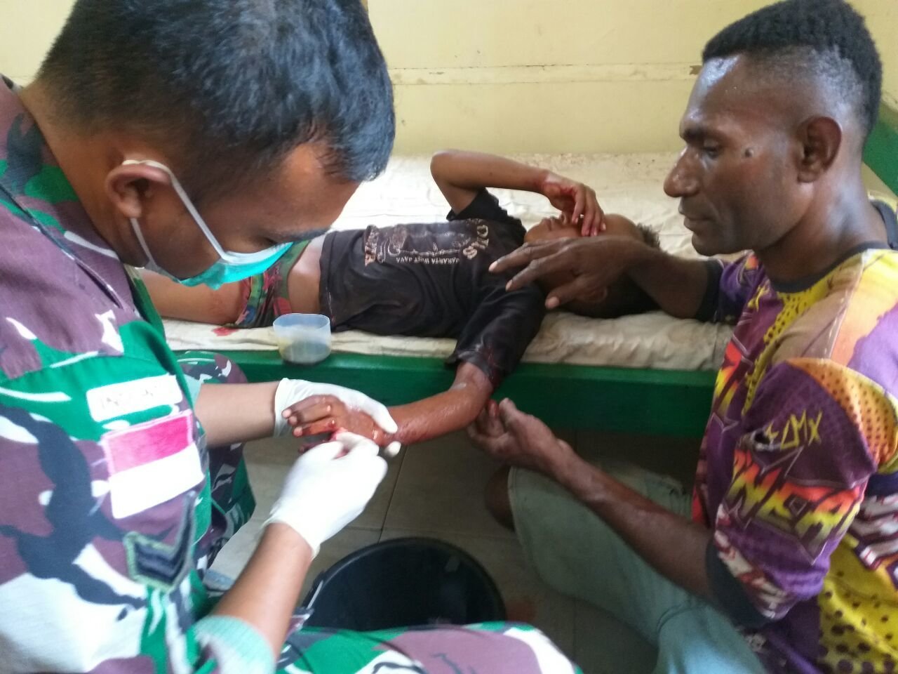 Dikatakan Dansatgas bahwa Agustinus Gebze yang diantar keluarganya ke Pos Kotis untuk meminta bantuan pengobatan, lantaran pergelangan tangan kirinya terluka cukup dalam akibat terkena benda tajam beruapa parang saat sedang bermain dengan temannya.