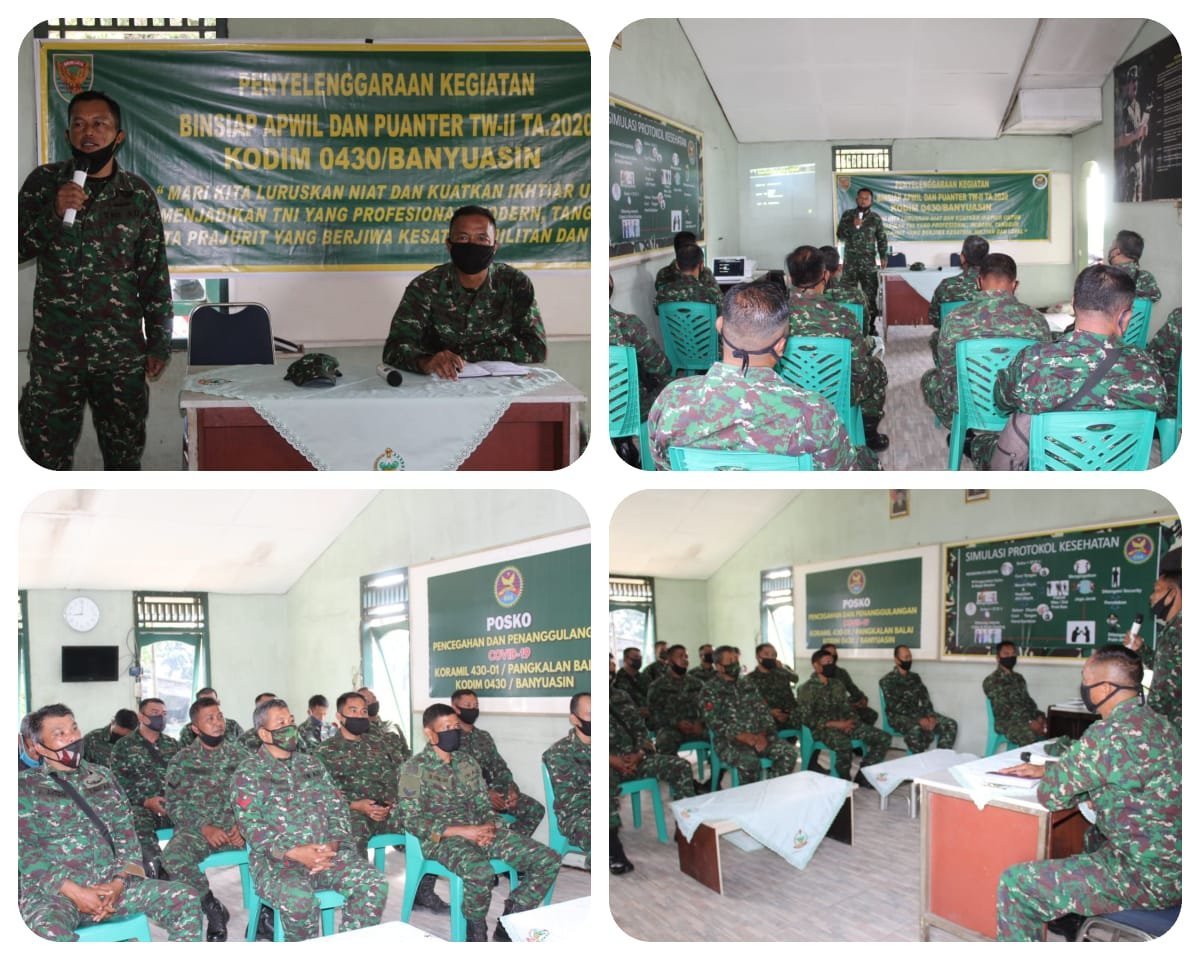 BANYUASIN,Krsumsel.com – Kodim 0430/BA, melaksanakan kegiatan Pembinaan Kesiapan Aparat Kewilayahan (Binsiap Apwil) dan Kemampuan Teritorial (Puanter) triwulan tahun 2020, dengan tema “Mari kita luruskan niat dan kuatkan ikhtiar untuk menjadikan TNI yang propesional, modern,Tangguh serta prajurit yang berjiwa Ksatria, Militan dan Loyal”, bertempat di Koramil 401-01/Pangkalan Balai, Senin (20/7/2020)
