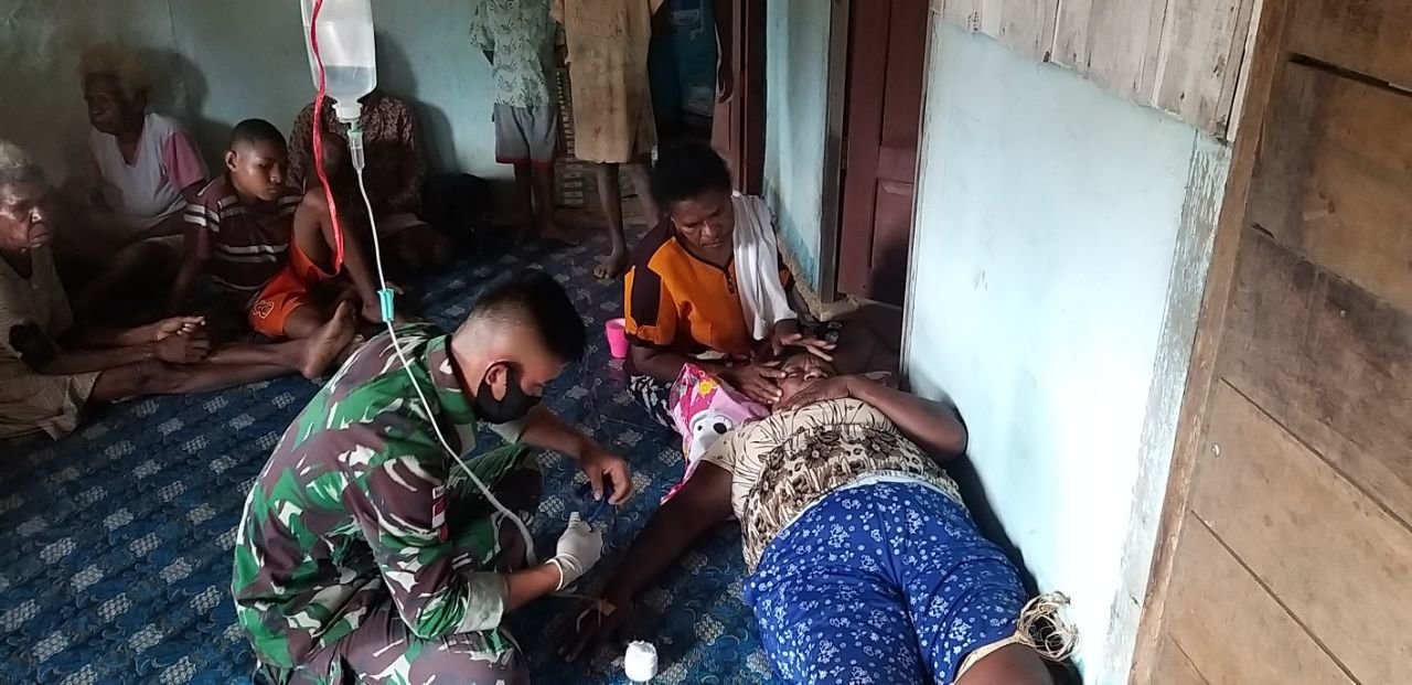 Setibanya di rumah Ibu Tabita, Tim Kesehatan Satgas Yonif 125 memeriksa kondisinya terlebih dahulu, kemudian melakukan tindakan medis dengan memberikan cairan infus RL Ecosol. “Kita bersyukur, setelah mendapatkan pertolongan pertama, kondisi Ibu Tabita sudah semakin membaik,” ujar Dansatgas.