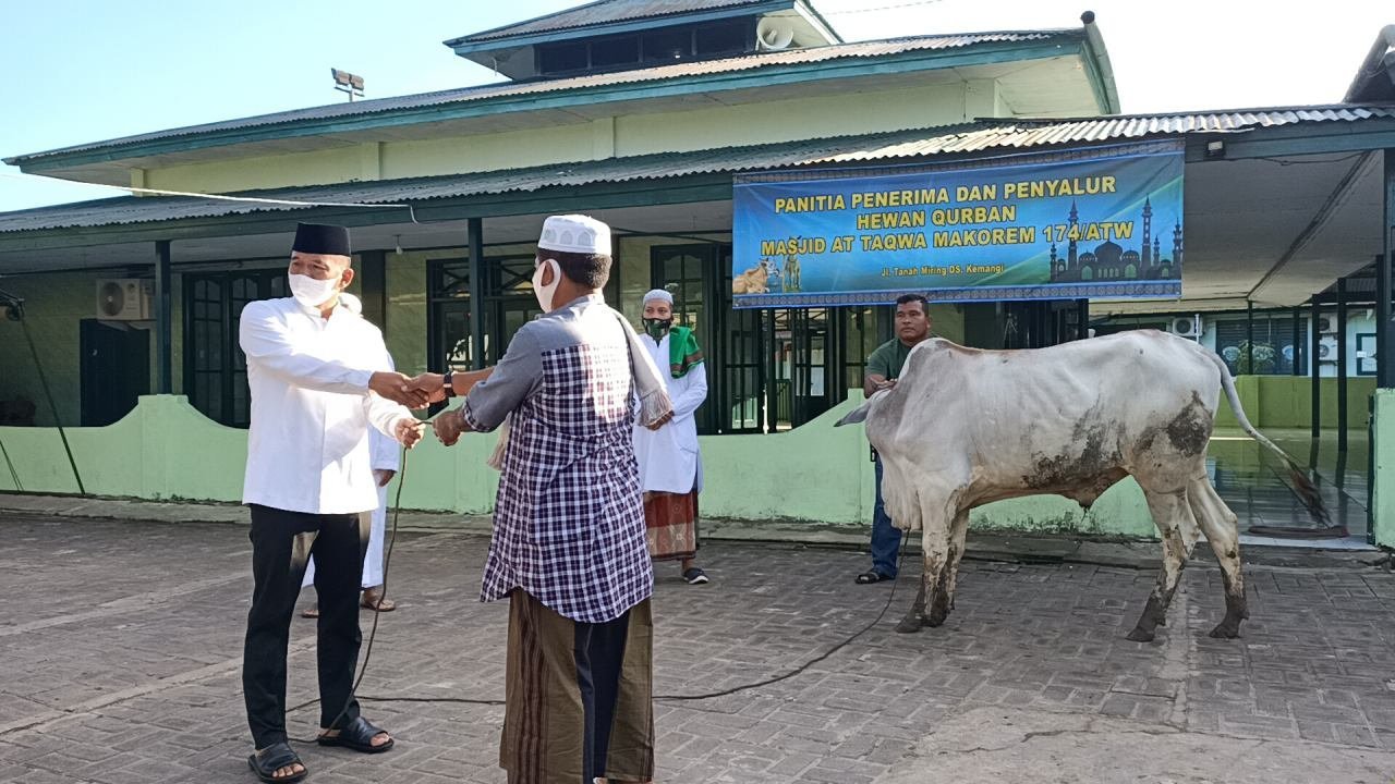 Hewan kurban tersebut diserahkan langsung secara simbolis oleh Komandan Korem (Danrem) 174/ATW Merauke Brigjen TNI Bangun Nawoko kepada Panitia Penerimaan dan Penyaluran Hewan Kurban dengan tetap mengikuti prosedur Covid-19, bertempat di Masjid At-Taqwa Markas Korem 174/ATW, Distrik Tanah Miring, Kab. Merauke, Provinsi Papua, Jumat (31/7/2020).