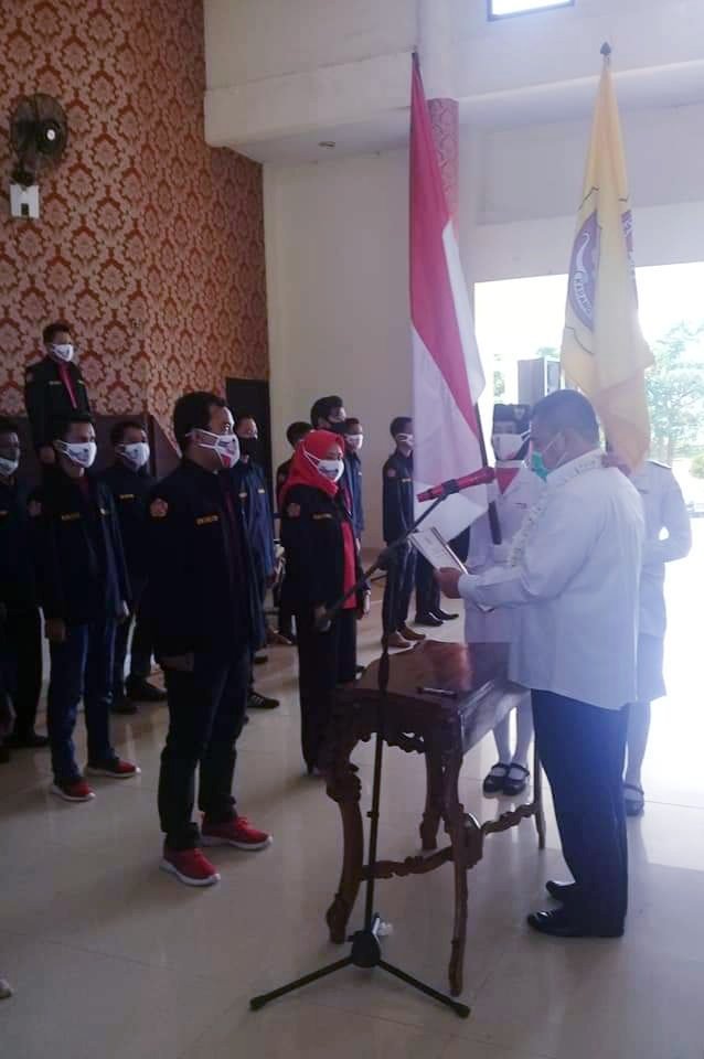 Tampak Bupati OI HM Ilyas Panji Alam sudah beraktivitas normal dan hadir memberikan sambutan dalam Pelantikan Karang Taruna Kecamatan Indralaya di Gedung Pendopoan Tanjung Senai, Rabu (12-08).