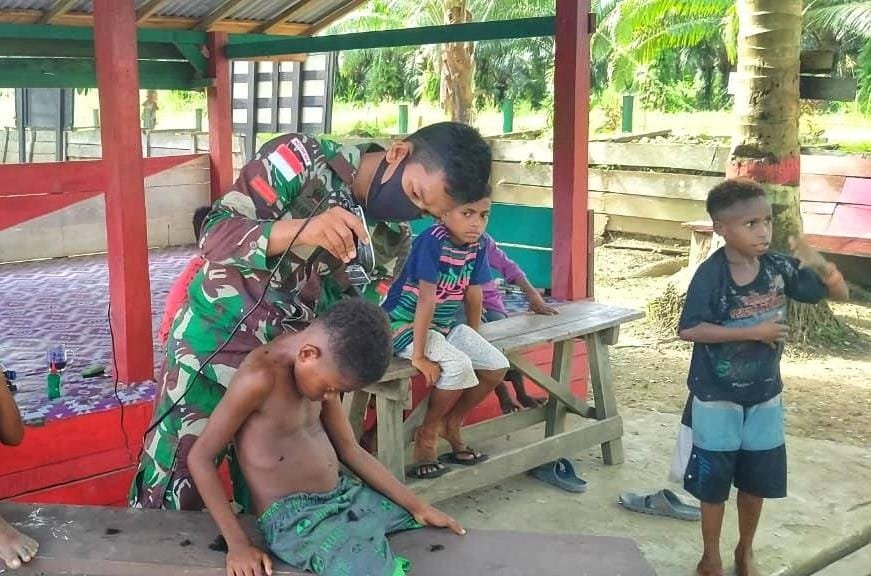 KRsumsel.com – (Jayapura). Prajurit Satgas Pamtas RI-PNG Yonif Mekanis Raider 413 Kostrad mengadakan cukur massal anak-anak Kampung Pitewi Distrik Arso Timur Kabupaten Keerom yang telah kembali belajar tatap muka di reguler Sekolah SD Pitewi sejak sepekan lalu.