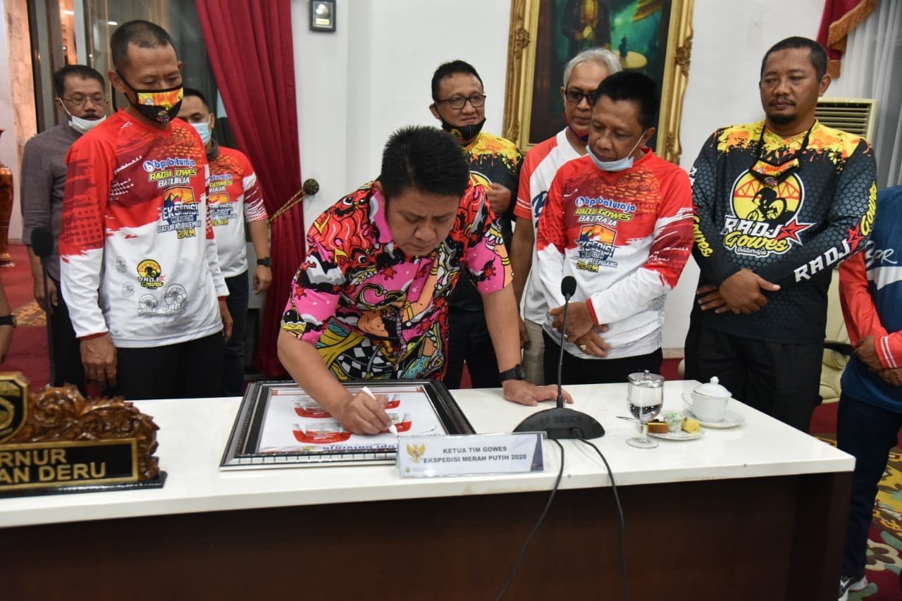 Kedatangan tim ekspedisi merah putih tersebut diterima langsung Gubernur Sumsel H Herman Deru. Bahkan, HD pun menyambut baik komitmen puluhan anggota Raja Gowes tersebut.
