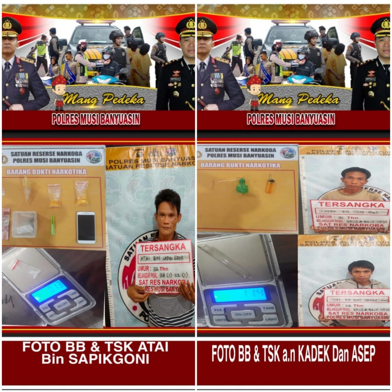 “Ketiga pelaku kita tangkap di sebuah pondok milik Atai (tersangka), yang merupakan penyedia tempat dan narkoba. Tidak hanyak Atai yang ditangkap, dari sini turut kita amankan dua orang tersangka lainnya yang tengah mengkonsumsi sabu-sabu yakni Kadek dan Asep, ” ungkap Kapolres Muba AKBP Erlin Tangjaya, SH, SIK melalui Kasat Narkoba AKP Jonroni Hasibuan kepada awak media, Senin (07/09/2020).