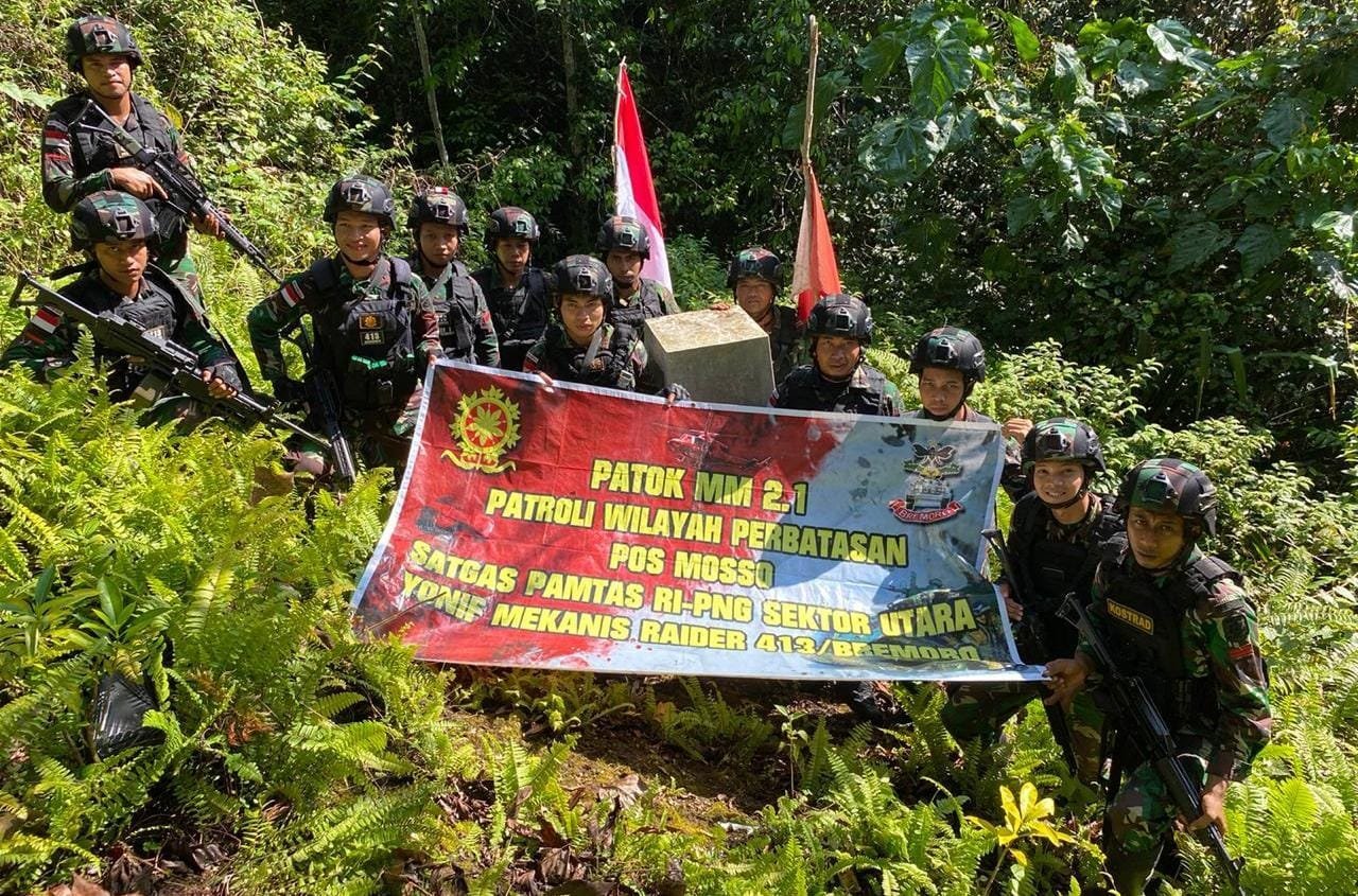 (Jayapura-Papua. Senin, 14 September 2020). kRsumsel.com – Satgas Pamtas RI-PNG Yonif Mekanis Raider 413 Kostrad Pos Mosso pimpinan Letda Inf Hanura melaksanakan patroli wilayah perbatasan di Patok MM 2.1.