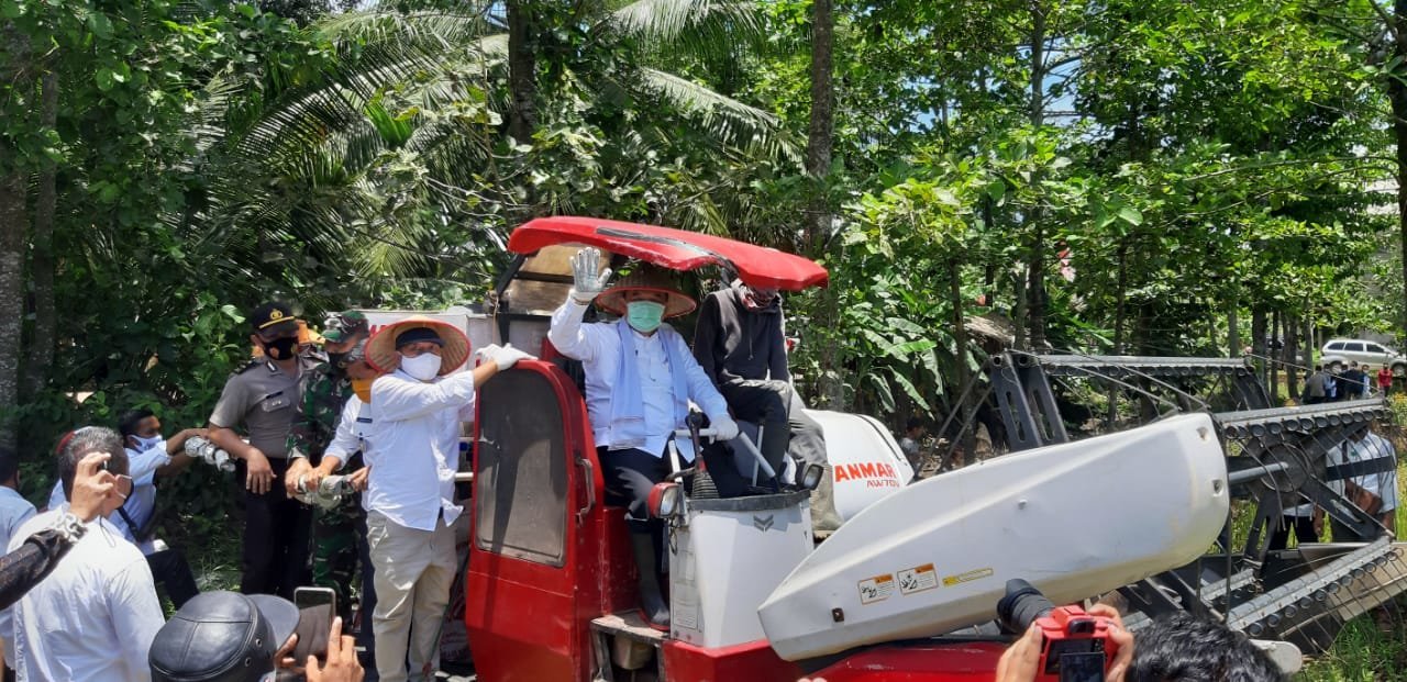 Bupati OI HM. Ilyas Panji Alam didampingi Kepala OPD Pemkab OI, Camat Rantau Panjang Lukman Ajis, Kades Sungai Rotan Ridho Wahyudi, Kades Se-Kecamatan Rantau Panjang serta ratusan masyarakat Desa Sungai Rotan menggelar Panen Raya Padi Bersama di Desa Sungai Rotan Kecamatan Rantau Panjang OI, Rabu (16/09).