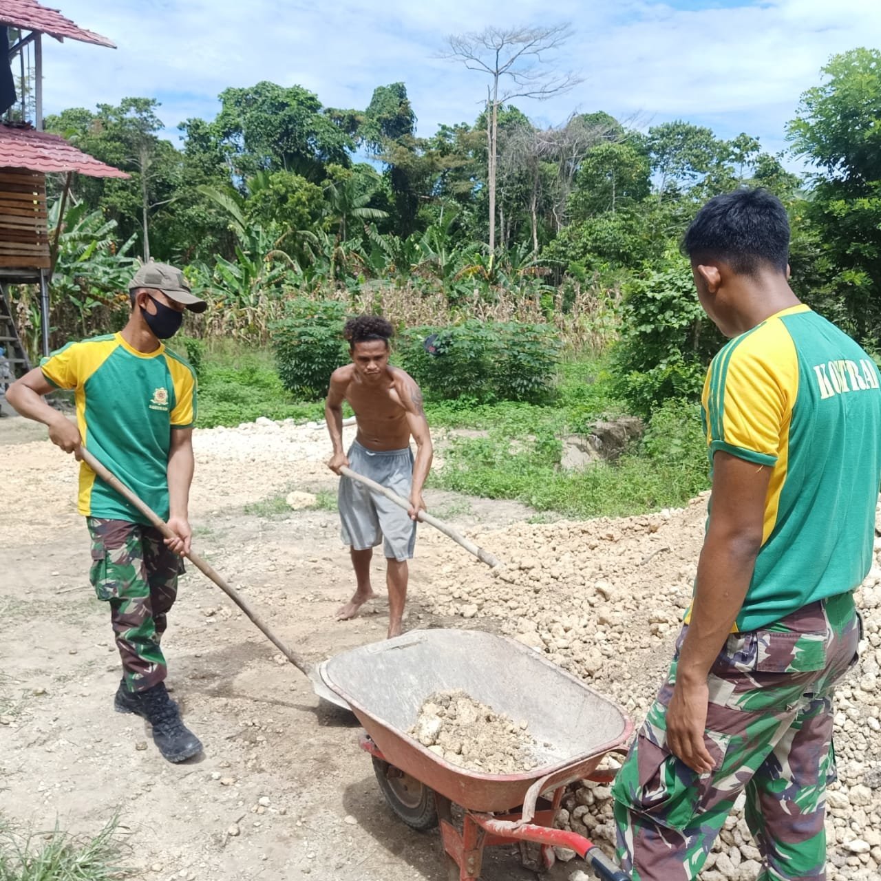 (Jayapura-Papua). KRSUMSEL.com – Satgas Pamtas RI-PNG Yonif Mekanis Raider 413 Kostrad Pos Ramil Tami membantu warga memperbaiki akses jalan di Kampung Skouw Sae Distrik Muara Tami, Kota Jayapura.
