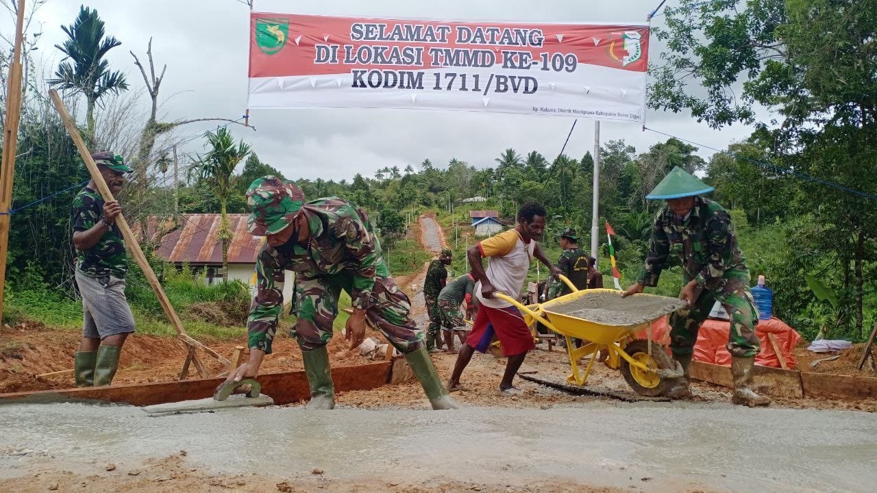 Dalam kegiatan tersebut, anggota Satgas TMMD 109 Kodim 1711/BVD bersama warga masyarakat saling bergotong royong melakukan pengecoran jalan program fisik TMMD Reguler ke-109, agar pengerjaannya cepat selesai.