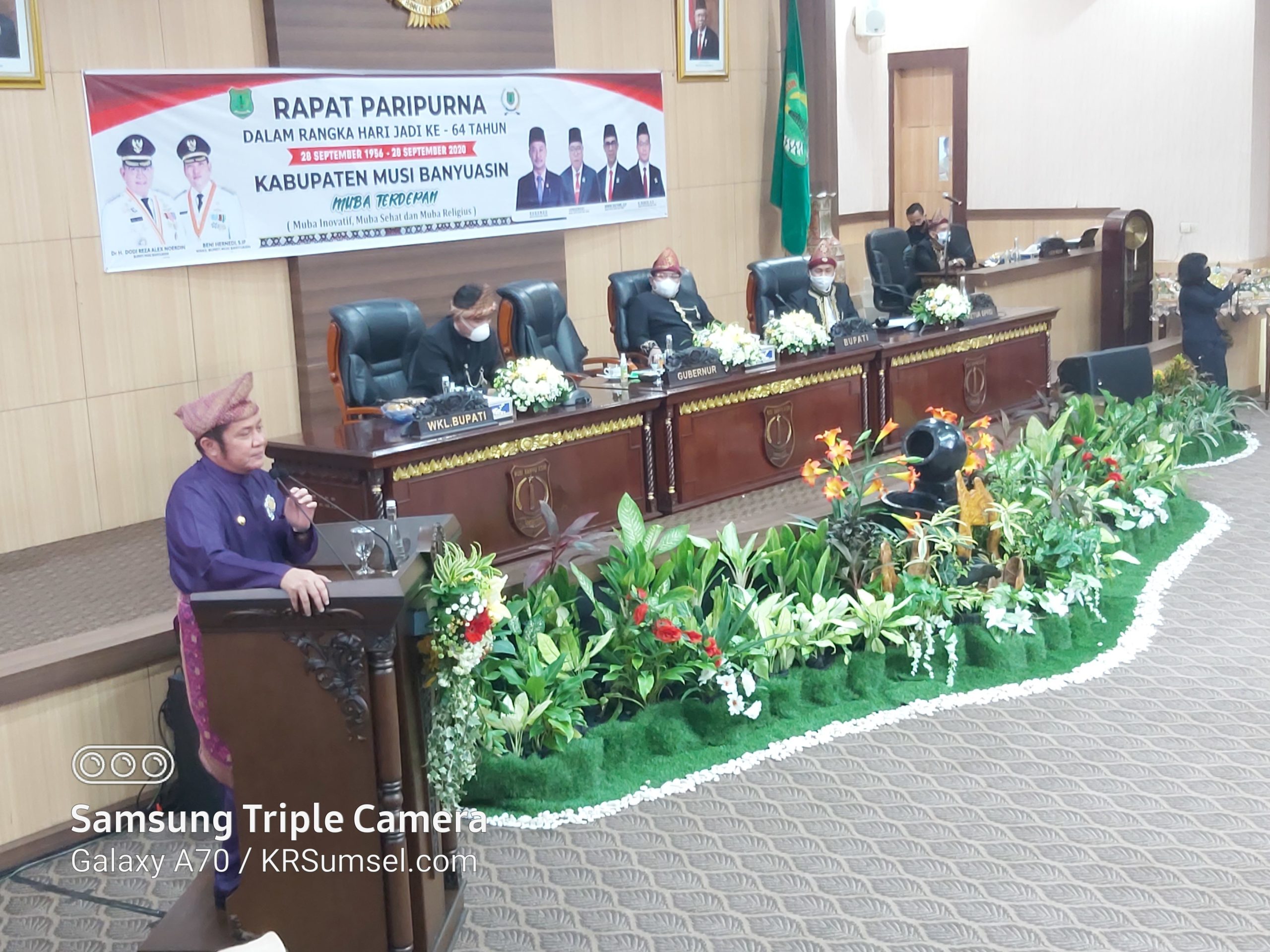 Dalam kesempatan Rapat Paripurna DPRD Kabupaten Musi Banyuasin dalam rangka Peringatan Hari Jadi ke-64 Kabupaten Musi Banyuasin Tahun 2020 juga turut dihadiri secara virtual oleh Pangdam II/Sriwijaya, Kapolda Sumsel, serta Bupati/Wali Kota se-Sumsel. Kemudian, hadir secara fisik Forkopimda Muba Dandim 0401 Muba Letkol Arh Faris Kurniawan SST MT, Kapolres Muba AKBP Erlin Tangjaya SH SIK, Kajari Muba Suyanto SH MH, Kepala Pengadilan Negeri Hendra Halomoan SH MH, dan Kepala Pengadilan Agama Saifullah Anshari SAg MAg.(AS)