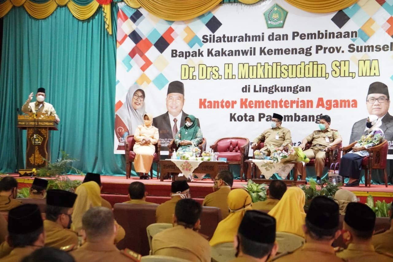 Palembang, KRSUMSEL.com – Kakanwil Kemenag Sumsel Dr. Drs. H. Mukhlisuddin SH, MA memberikan pembinaan kepada aparatur sipil negara (ASN) Kemenag Kota Palembang di Aula MAN 3 Palembang, Senin (28/9). Hadir dalam acara pembinaan Kabag Tata Usaha H. Abadil S.Ag, M.Si, Kakankemenag Kota Palembang H. Deni Priansyah S.Ag, M.Pd.I, Ketua DW Kanwil Kemenag Sumsel Dra. Hj. Sumalihah M.Pd, Kasubbag Umum dan Humas Kanwil Kemenag Sumsel Dr. H. Saefudin M.Si, serta para ASN Kemenag Kota Palembang.