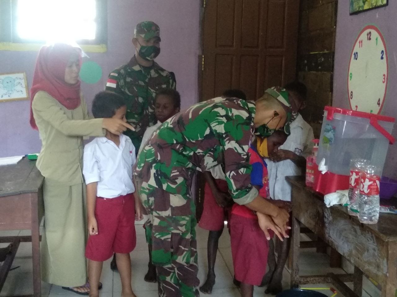 (Merauke). KRSUMSEL.com – Prajurit Yonif 125/Simbisa yang tergabung dalam Satgas Pamtas RI-PNG dan berada di bawah Komando Pelaksana Operasi (Kolakops) Korem 174/ATW memberikan edukasi cara sigat gigi dan cuci tangan yang benar kepada siswa-siswi Sekolah Dasar YPPK ST. Fransiskus Xaverius Yanggandur, Distrik Sota, Kab. Merauke, Selasa (29/9/2020).