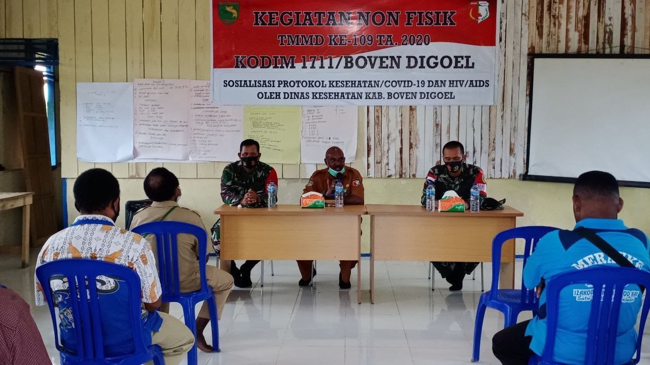 Kegiatan yang dilaksanakan Satgas TMMD Reguler ke-109 Kodim 1711/Boven Digoel bersama dengan Dinas Kesehatan dalam hal ini Puskesmas Mindiptana bersinergi menggelar Sosialisasi Protokol Kesehatan / Covid-19 dan HIV / AIDS kepada masyarakat yang berada di lokasi TMMD, Kampung Kakuna, Distrik Mindiptana, Kab. Boven Digoel, Papua, Selasa (29/9/2020).