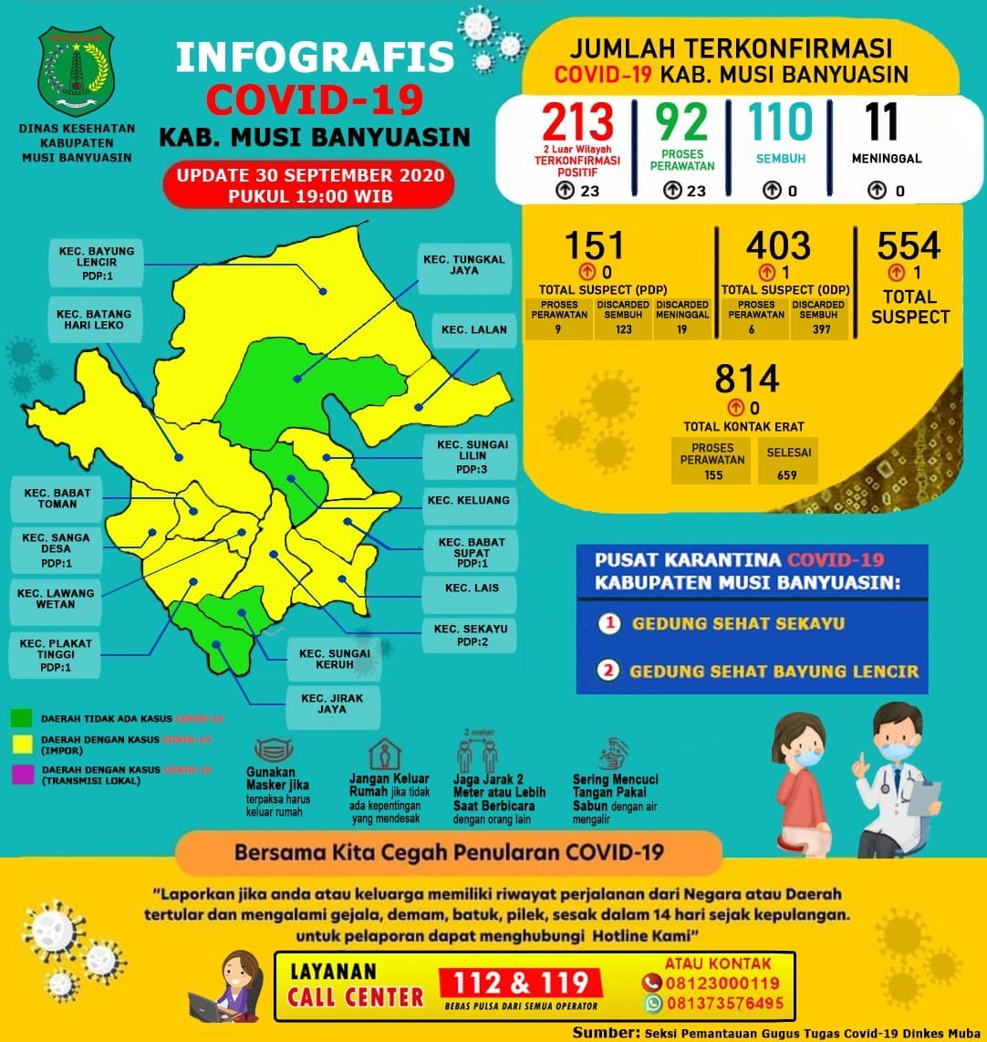 Sefti mencatat hingga 30 September 2020 ada sebanyak 213 kasus terkonfirmasi di Muba. “110 kasus sembuh, 11 meninggal dunia, dan 92 orang masih dirawat,” terangnya.