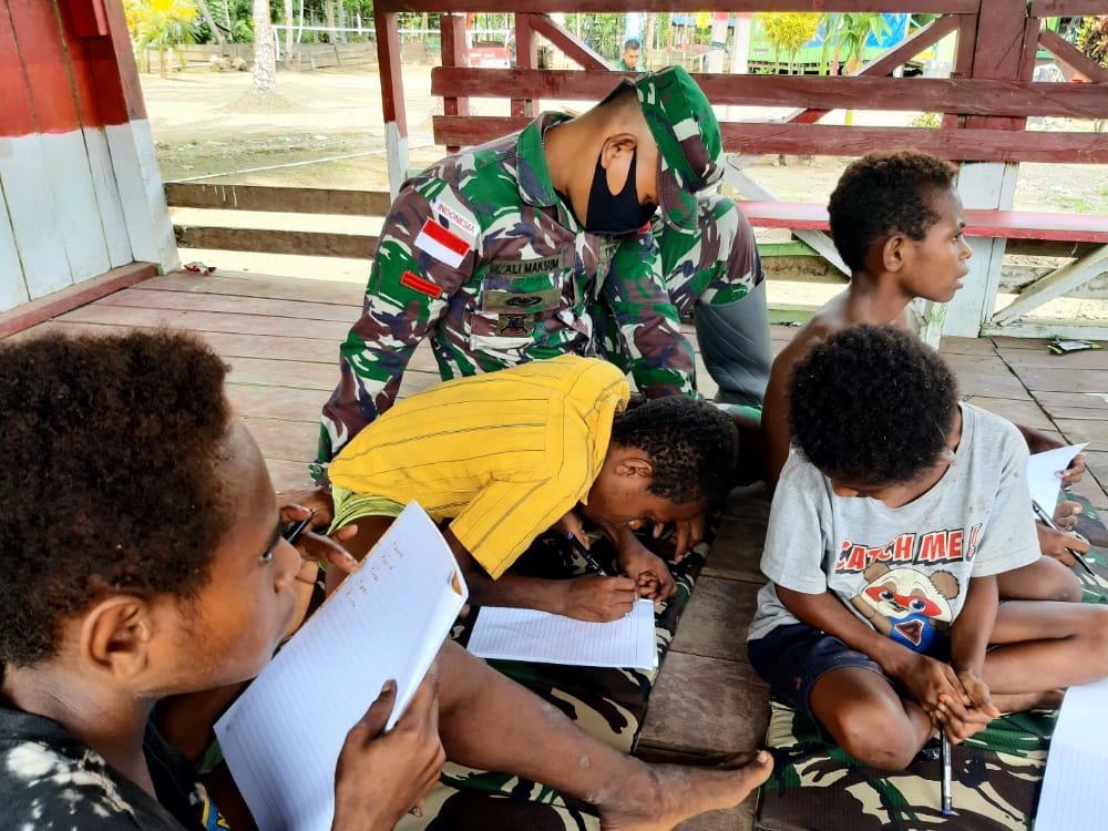 (Jayapura-Papua). KRSUMSEL.com – Dalam upaya menekan angka anak putus sekolah di wilayah perbatasan Papua, Satgas Pamtas RI-PNG Yonif Mekanis Raider 413 Kostrad Pos Kaliasin menggelar sekolah darurat di Kampung Kibay Distrik Arso Timur Kabupaten Keerom.
