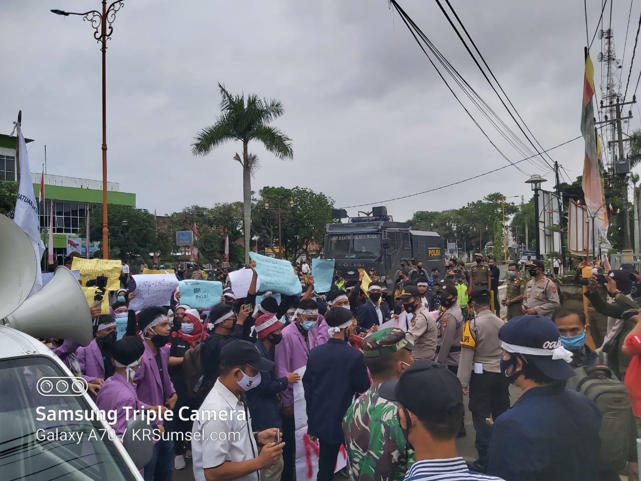 Pantauan KRSumsel.com, massa terlihat berdemo di halaman Gedung DPRD Muba jalan Kolonel Wahid Udin, Senin (12/10/2020).