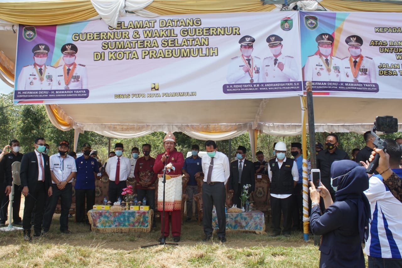 Prabumulih, KRSUMSEL.com – Sesaat usai menghadiri rapat paripurna DPRD dalam rangka memperingati hari jadi Kota Prabumulih ke-19, Sabtu (17/10/20), Gubernur Sumsel H. Herman Deru turun langsung melakukan pengecoran pertama pembangunan jalan penghubung Desa Jungai dan Desa Tanjung Miring Kabupaten Ogan Ilir (OI). Jalan penghubung ini dapat dituntaskan pembangunannya berkat bantuan senilai Rp30 miliar yang diguyurkan Gubernur ke Kota Prabumulih pada tahun 2020.
