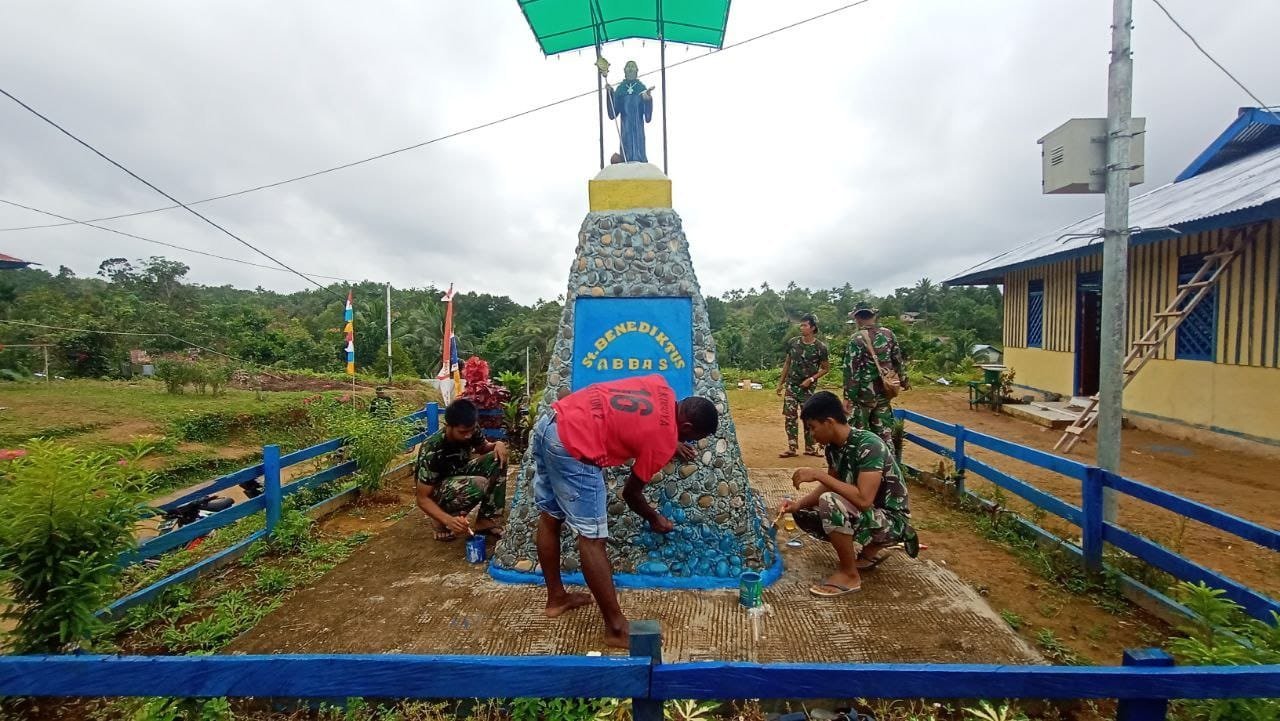 Kali ini para personel Satgas TMMD melakukan pengecatan dan pembuatan bangku Wisata Rohani Goa Maria dan Patung ST. Benediktus Abbas yang berada di Kampung Kakuna, Distrik Mindiptana, Kabupaten Boven Digoel, Papua, Minggu (18/10/2020).
