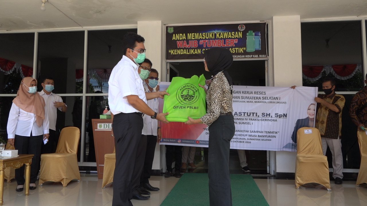 Renny Astuti mengatakan, dirinya menyempatkan hadir langsung ke DLH Kabupaten Muba untuk menyampaikan bantuan dari Kementerian Lingkungan Hidup dan Kehutanan RI, yaitu berupa 100 paket Alat Pelindung Diri dan lima kotak sampah Tematik.