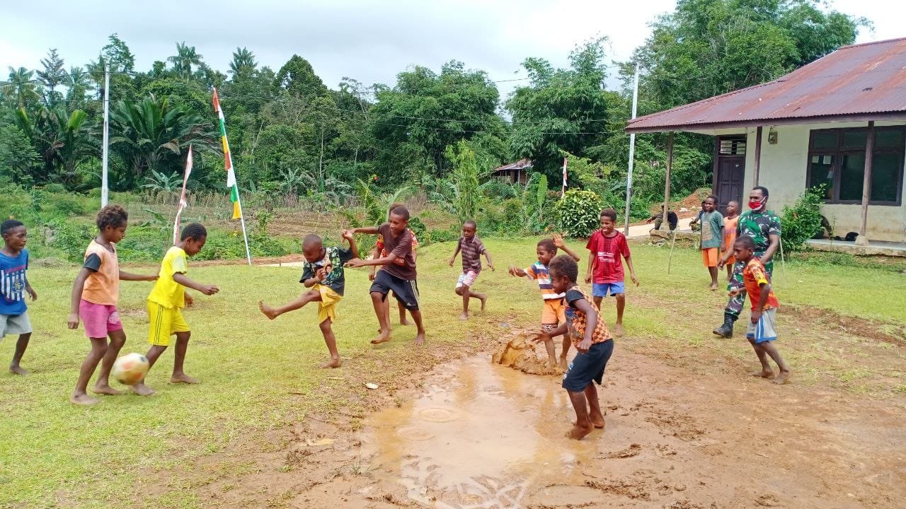 Dengan bermodalkan bola plastik dan batang kayu sebagai gawang, tidak mengurangi semangat anggota satgas Sertu Erik Nugraheni bersama rekan-rekannya maupun anak-anak Kampung Kakuna bermain bola bersama.