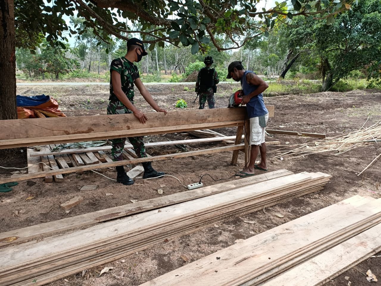 Seperti yang dilakukan empat orang personel Satgas dari Pos Kuler yang turut berpartisipasi membantu pembangunan rumah bapak Gepson Laun (47 th) warga perbatasan di Kampung Onggaya, Distrik Naukenjerai, Kabupaten Merauke, Jumat (23/10/2020).