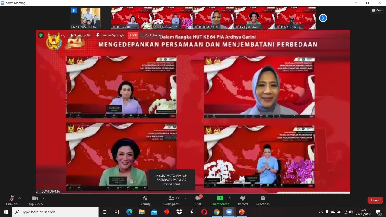 Hal tersebut disampaikan Ketua Umum (Ketum) Dharma Pertiwi Ny. Nanny Hadi Tjahjanto pada acara Seminar Kebangsaan dengan tema “Mengedepankan Persamaan dan Menjembatani Perbedaan” yang dilaksanakan secara virtual dalam rangka HUT ke-64 PIA Ardhya Garini yang jatuh pada 25 November 2020, bertempat di Komplek Halim Perdana Kusuma, Jakarta Timur, Jumat (23/10/2020).