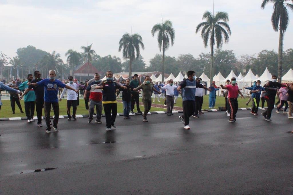 PALEMBANG, KRSUMSEL.con – Masih dalam rangkaian memeriahkankan Festival Rempah Sumsel 2020. Gubernur Sumsel H. Herman Deru dan Ketua Tim Penggerak (TP) PKK Sumsel Hj. Febrita Lustia HD, Minggu (25/10) membaur dengan ribuan masyarakat dalam senam sehat yang dilaksanakan di halaman Griya Agung Palembang.