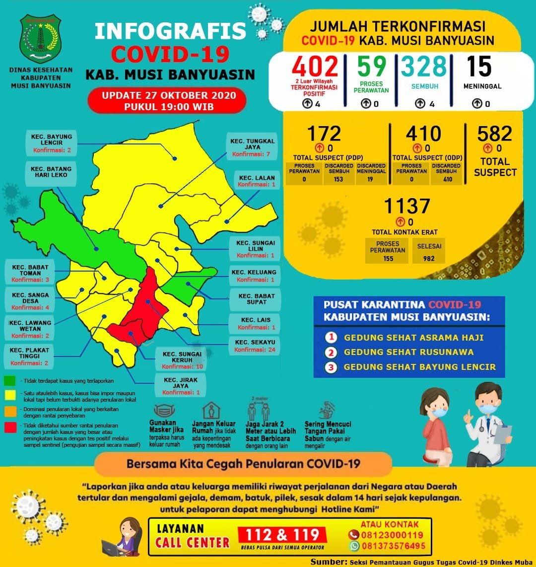 “Hingga 27 Oktober 2020 ada sebanyak 402 kasus terkonfirmasi di Muba. “Yakni diantaranya 328 kasus sembuh, 15 meninggal dunia, dan 59 masih dirawat,” bebernya.