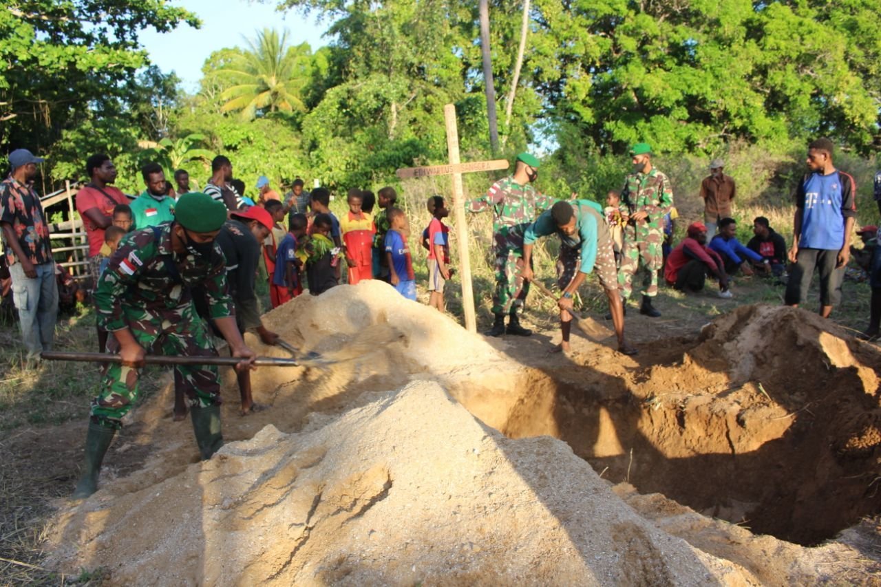 (Merauke). KRSUMSEL.com – Sebagai bentuk kepedulian dan rasa empati terhadap sesama, Satgas Pamtas Yonif 125/Simbisa di bawah Komando Pelaksana Operasi (Kolakops) Korem 174/ATW turut menghadiri dan membantu proses pemakaman seorang bapak, yaitu suami dari Ibu Ruth Mbanggu (50 th) yang meninggal karena sakit.