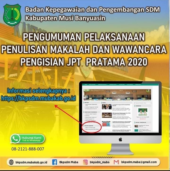 Pengumuman ini terbit pada tanggal 4 November 2020 melalui laman resmi Badan Kepegawaian dan Pengembangan Sumber Daya Manusia (BKPSDM) Kabupaten Muba (https://BKPSDM.mubakab.go.id) dengan Nomor : 09/Pansel/JPTP Muba/2020 yang ditandatangani Ketua Panitia Seleksi JPTP Kabupaten Muba Prof Ir Zainuddin Nawawi PhD.