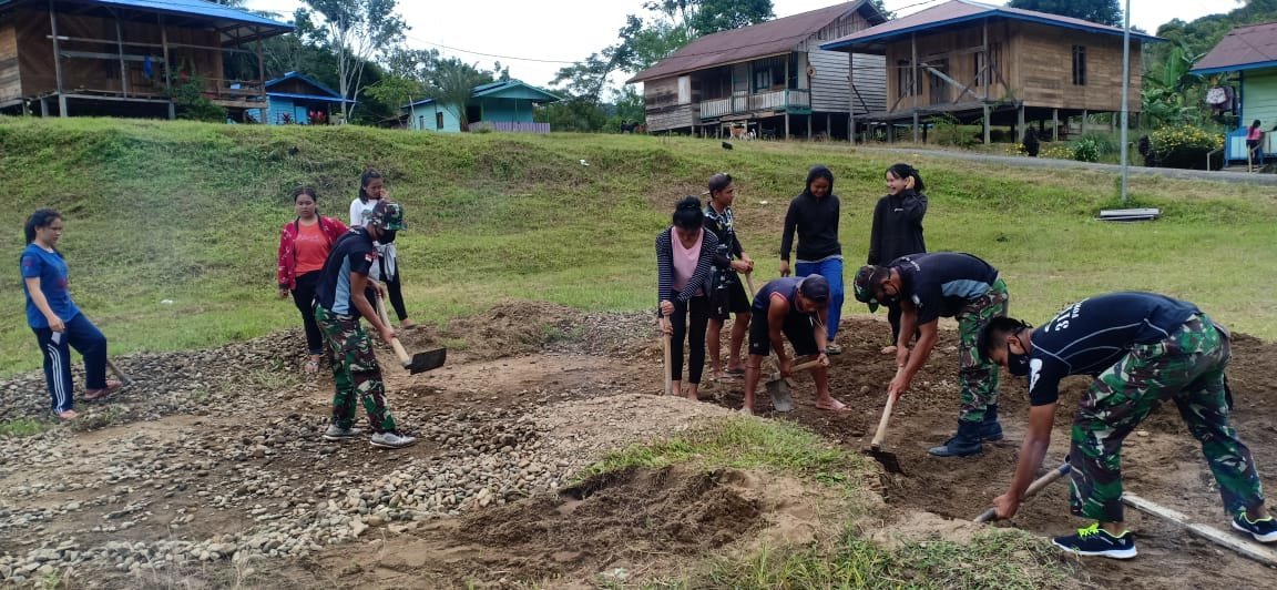 *Malinau* KRSUMSELcom – Personel Pos Long Betaoh Satgas Pamtas RI-MLY Yonif Raider 200/BN bergotong-royong bersama Karang Taruna membangun sarana olah raga lapangan Bola Voli di Desa Long Betaoh, Kecamatan Long Betaoh, Kabupaten Malinau, Provinsi Kalimantan Utara.