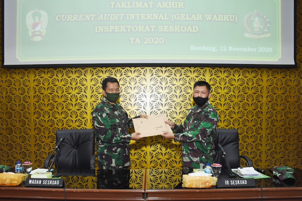 Bandung,KRsumsel.com – Selama 14 hari Seskoad Gelar pengawasan Current Audit di jajaran satuan kerjanya telah selesai, ini merupakan bentuk pengawasan terhadap Program Kerja (Progja) dan anggaran yang baru saja atau sedang dilaksanakan pada tahun berjalan, bertempat di Gd. Prof. Dr. Satrio Seskoad, Bandung,Kamis (12/11/2020).