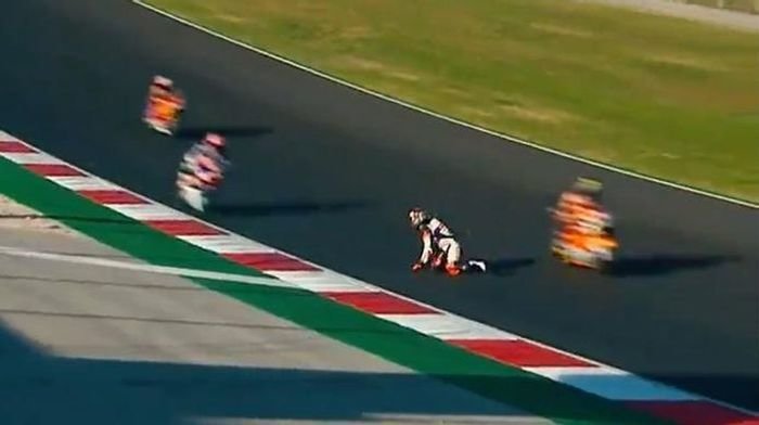Bagusnya, Aron Canet dengan jitu mampu memperkirakan situasi. Ia sempat berdiam sesaat ketika ada lima motor berseliweran di sekelilingnya. Setelah itu barulah ia langsung bergegas merangkak keluar lintasan, dengan satu motor lain tampak berkelebat.
