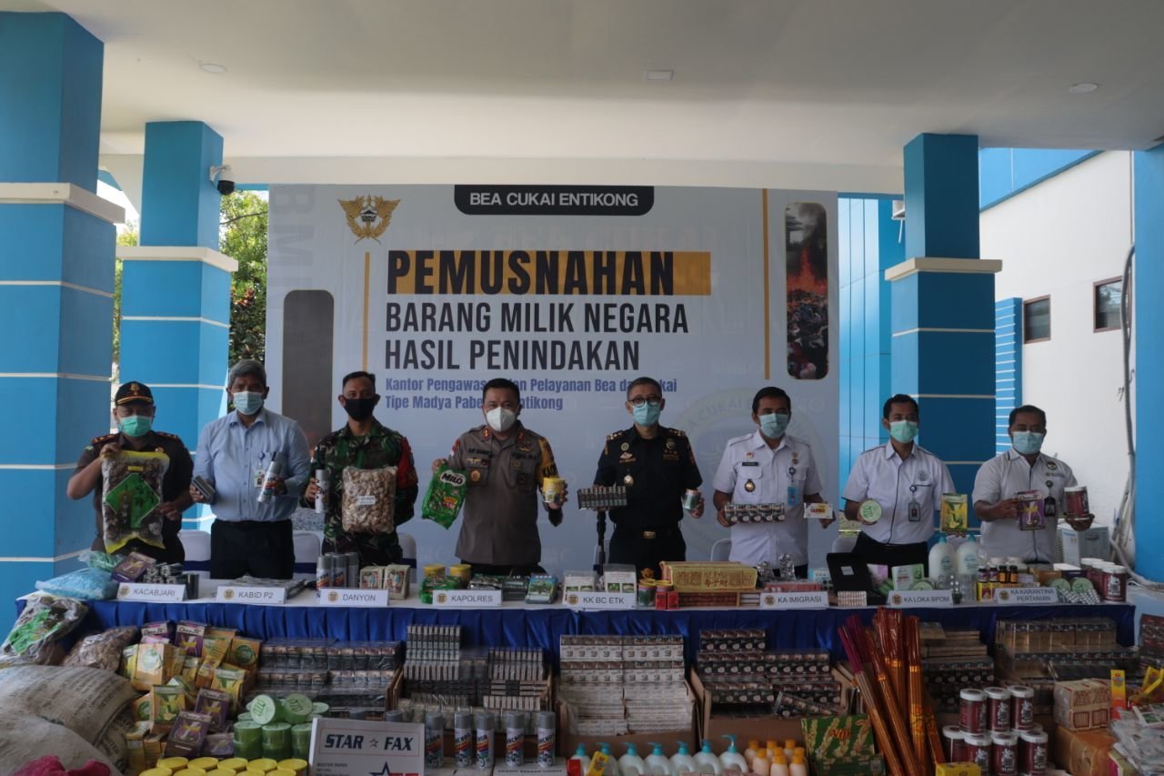 Dansatgas Pamtas Yonif 642/Kapuas, Letkol Inf Alim Mustofa mengatakan bahwa pemusnahan barang tersebut merupakan Barang Milik Negara yang merupakan hasil penindakan di Pos Lintas Batas Negara (PLBN) Entikong, penindakan di jalur tradisional, dan operasi bersama antara TNI AD dan Kepolisian RI serta operasi pasar Barang Kena Cukai periode BMN Februari 2019 s.d September 2020 bersama dengan seluruh Instansi yang di perbatasan RI-Malaysia wilayah kerja Entikong.