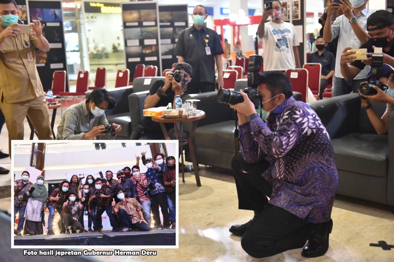 Usai didaulat melakukan jepretan di atas panggung, HD mendadak meminjam kamera salah seorang wartawan yang ada di dekatnya. Dengan gayanya bak fotograoher sungguhan, peraih penghargaan Gubernur Inovatif 2020 itu terus menjepret orang-orang di sekitarnya.