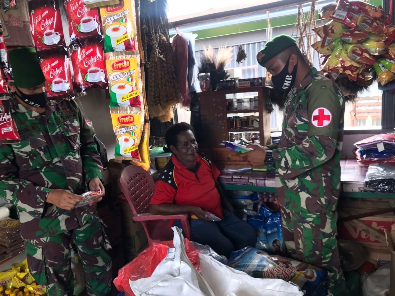 “Bersama petugas Kesehatan Puskesmas Sota dan aparat Kepolisian setempat, tiga orang personel Satgas dipimpin Danton Kes Satgas Letda Ckm Samsul Bahri, A.Md. Kep memeriksa makanan dan minuman yang dijual pedagang,” ujarnya.
