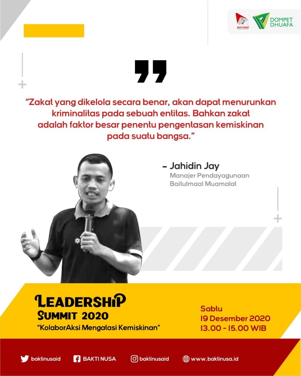 Melalui Leadership Summit 2020, BAKTI NUSA mengajak penerima manfaatnya berperan mencipta iklim ekonomi stabil melalui project leadership yang mereka buat. Pada Sabtu (19/12) 57 penerima manfaat BAKTI NUSA Angkatan 10 mengikuti Zakat Development Program Sharing bersama Jahidin Jay, Manajer Pendayagunaan Baitulmaal Muamalat.