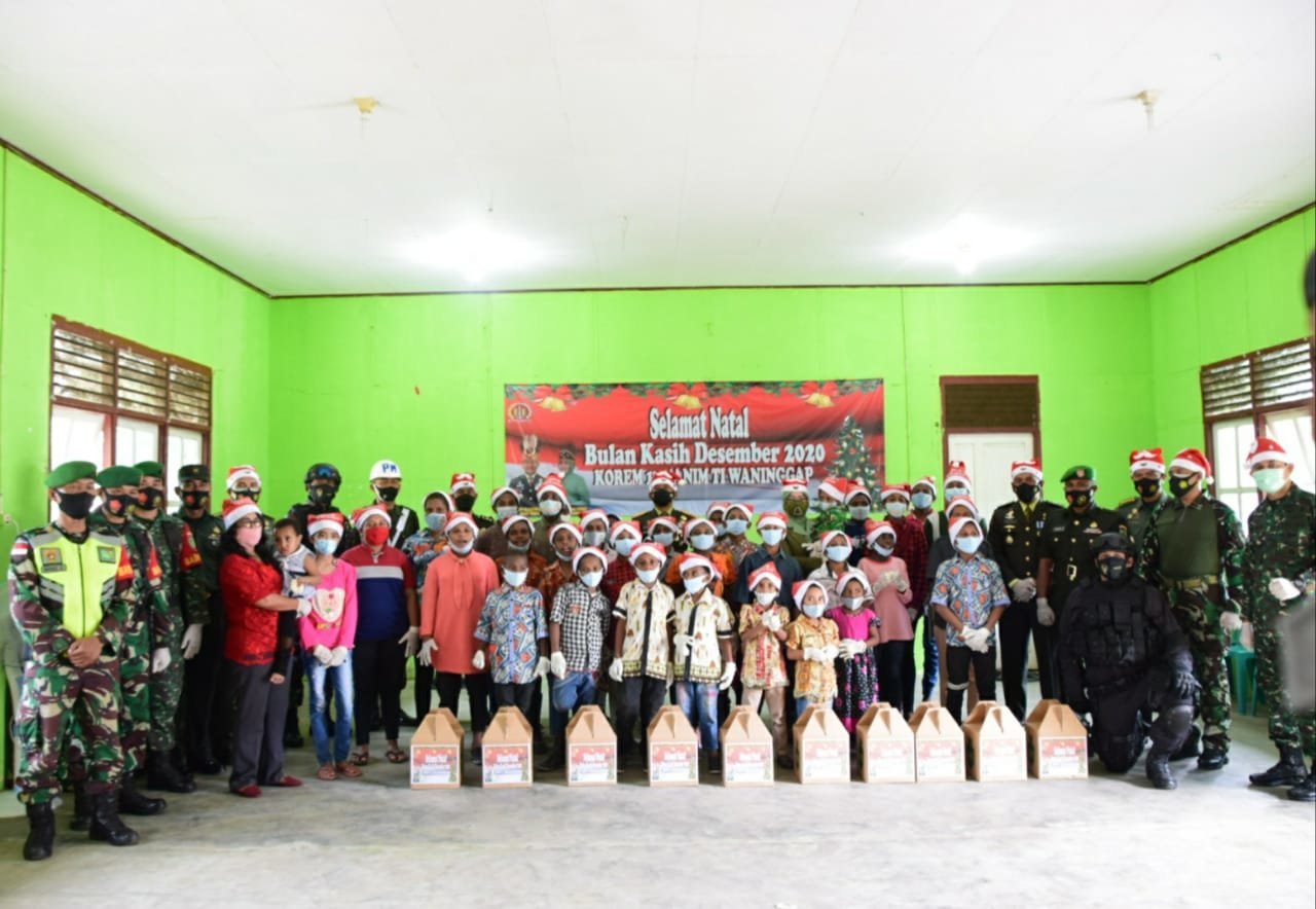 Dalam kesempatan tersebut, Danrem Merauke Brigjen TNI Bangun Nawoko didampingi Ny. Reny Bangun Nawoko memberikan bingkisan 40 paket Natal kepada anak-anak Panti Asuhan Kartini yang dihuni oleh 40 orang anak.