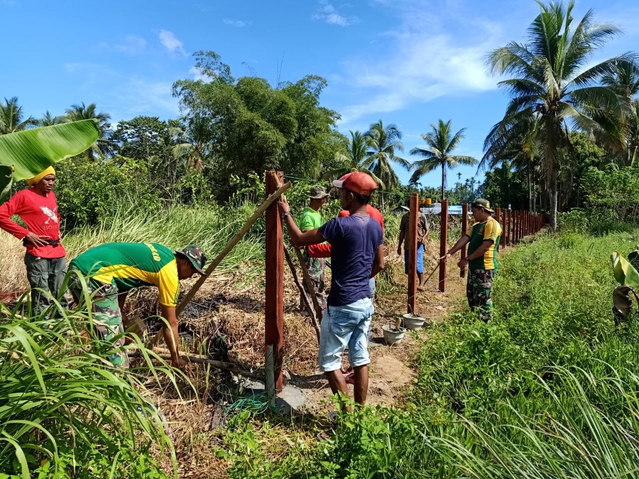 Jayapura, KRsumsel.com – Satgas Pamtas RI-PNG Yonif Mekanis Raider 413 Kostrad Pos Ramil Tami bersama masyarakat bergotong royong membangun pagar Masjid Al-Aqsho di Kampung Skouw Sae Distrik Muara Tami Kota Jayapura.