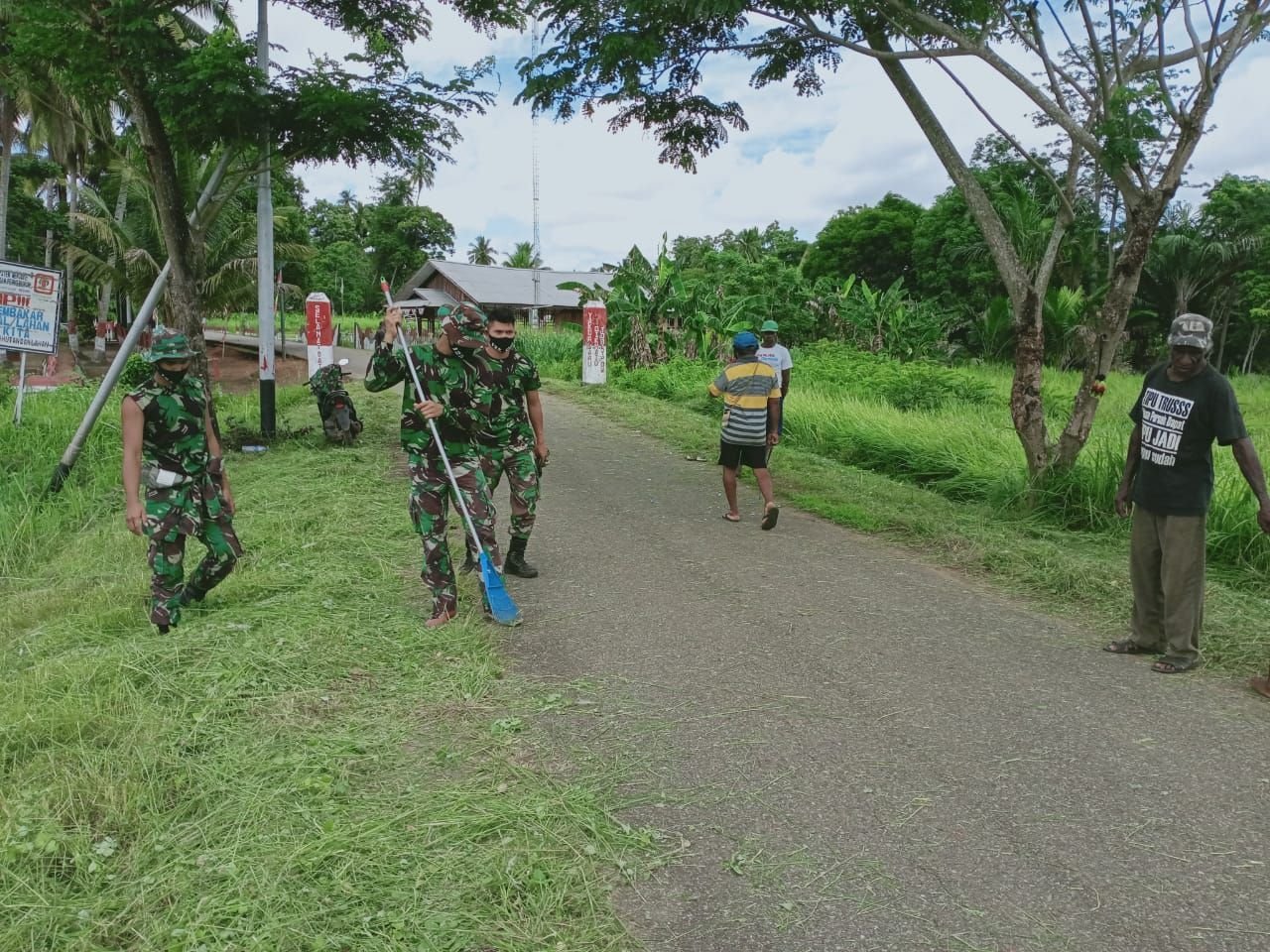Lebih lanjut dikatakan bahwa kegiatan gotong royong pembersihan jalan kampung tersebut dilaksanakan oleh delapan personel Satgas dari Pos Toray dipimpin Danpos Letda Inf Bambang Suprapto bersama warga membersihkan rumput yang tumbuh liar di kiri dan kanan jalan.