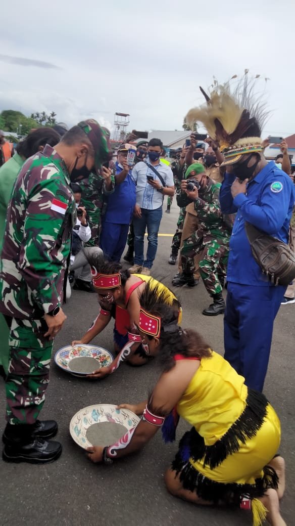 Kedatangan Pangdam XVII/Cenderawasih beserta rombongan di Bandara Udara Douw Aturure, Kabupaten Nabire, disambut oleh Danrem 173/PVB Brigjen TNI Iwan Setiawan, S.E., M.M., beserta para pejabat Korem 173/PVB dan Dandim 1705/Paniai Letkol Inf Beny Wahyudi serta masyarakat yang diiringi penyambutan secara tradisi adat oleh Kepala Suku Besar Wate dengan tarian Injak Piring Gantung.